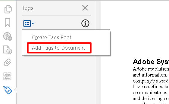 Open the PDF document that needs to be fixed in Adobe Acrobat. With the Tags panel open select Add Tags to Document from the Options button or with the Accessibility panel open in the Tools pane select the Add Tags to Document command See Figure 23. Click the Select a file button above or drag and drop a PDF into the drop zone.